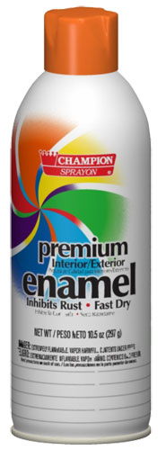 Champion Sprayon® Premium Enamel offers a broad range of colors and finishes. This multi-purpose, interior/exterior enamel dries quickly, provides excellent coverage and durability, and resists chipping and peeling. The line includes three finishes in black and three in white, four different metallic shades, a clear coat, and 15 colors in various finishes.