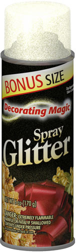 Decorating Magic® Spray Glitter adds sparkle to special-occasion and seasonal items. Convenient one-step spray includes both the adhesive and glitter. The superior adhesion is effective even on irregular surfaces like wreaths, baskets, fresh and dried floral arrangements.